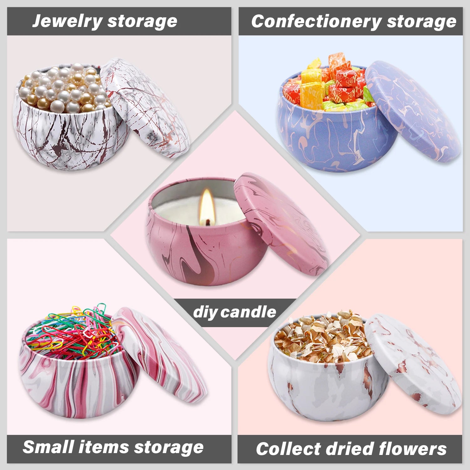 Ideal for DIY candle making projects: the top and sides of candle jars are easy to mark. In your business, they can make beautiful samples and giveaways, especially in small sizes. The covered tin is also a great storage container for craft projects and small items.