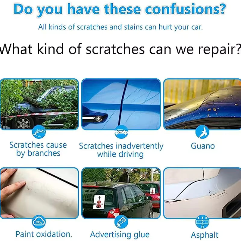 【Warm Tips】Car scratch repair cloth cannot be washed before use to ensure that the repair has been dry. If the mark-removing cloth falls onto the ground and is covered with ash or sand, please do not use it again. Please put it into the bag and tightly seal behind use.