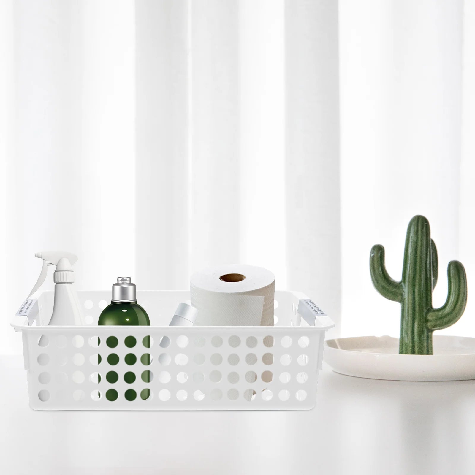 This is a multi-function storage basket, which is made of premium plastic material, sturdy and practical for a long-lasting use. Simple hollow design, and it offers you a large enough space to store different items, such as data cable, cosmetics, stationery, jewelry, and other small items. plastic storage basket