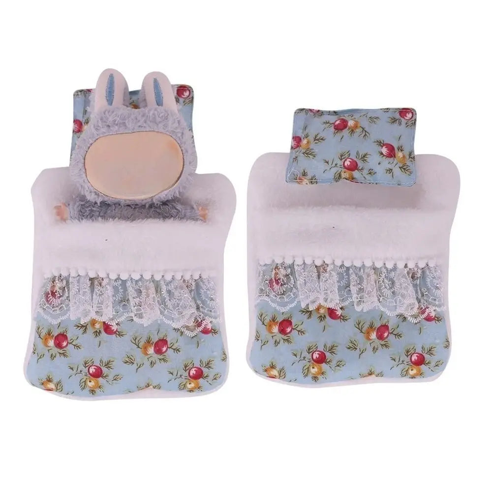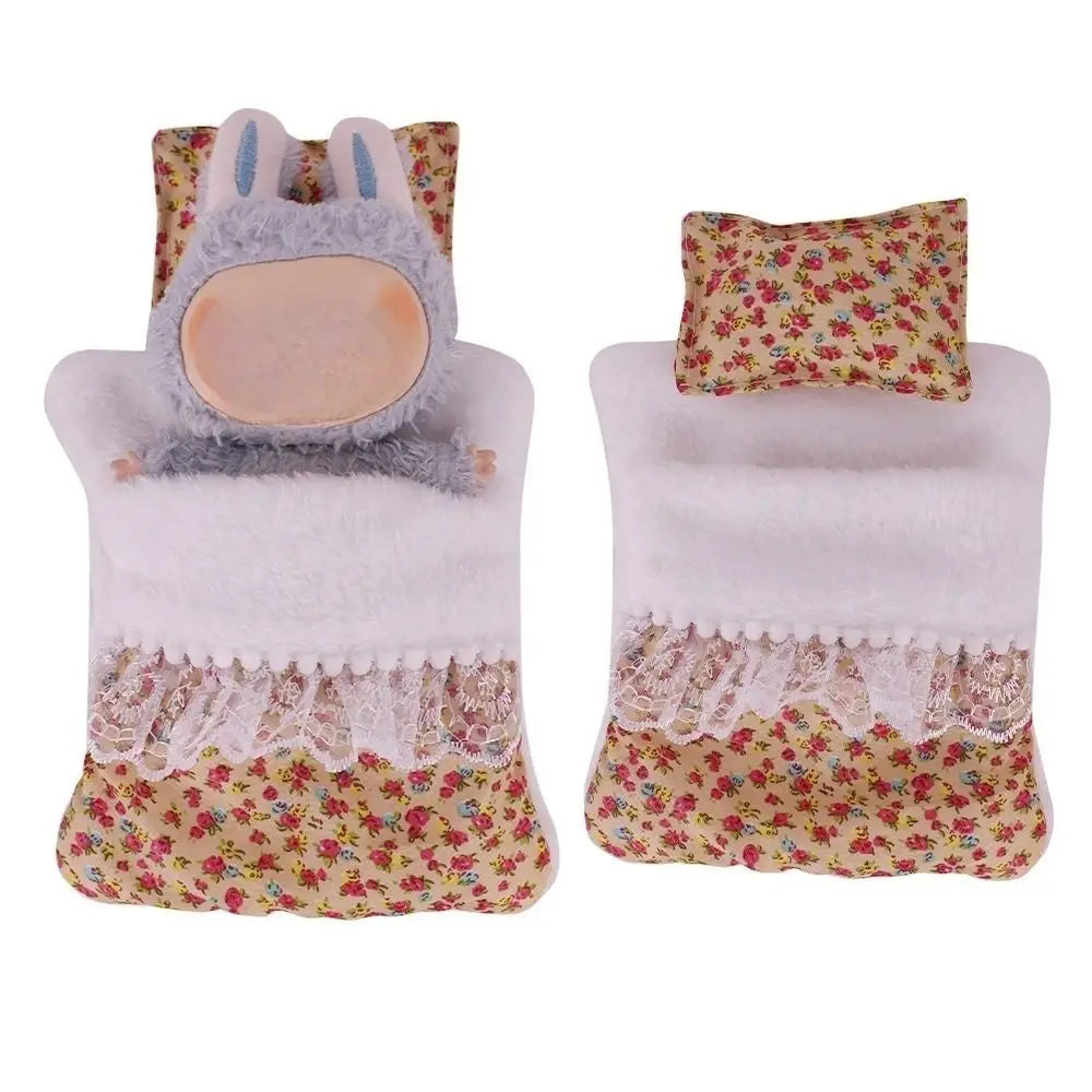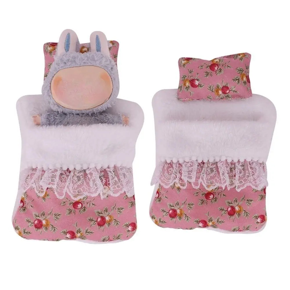 For 17cm Labubu Doll Accessories Sleeping Bag Cute Lace Style Doll Quilts Pillow Flower Strawberry Soft Doll Decoration Toys